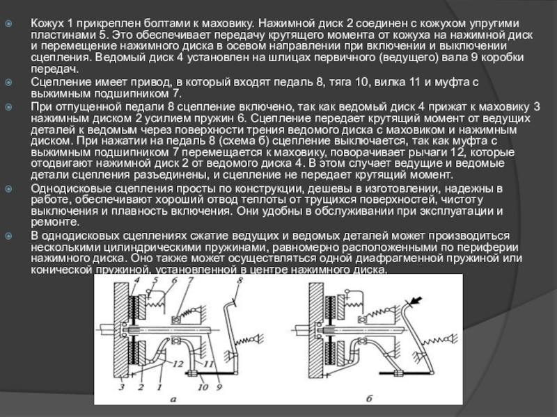 При отпущенной педали 8 сцепление включено, так как ведомый диск 4 прижат к маховику 3 нажимным диском 2 усилием пружин 6. Сцепление передает крутящий момент от ведущих деталей к ведомым через поверхности трения ведомого диска с маховиком и нажимным диском. При нажатии на педаль 8 (схема б) сцепление выключается, так как муфта с выжимным подшипником 7 перемещается к маховику, поворачивает рычаги 12, которые отодвигают нажимной диск 2 от ведомого диска 4. В этом случает ведущие и ведомые детали сцепления разъединены, и сцепление не передает крутящий момент.