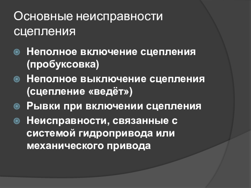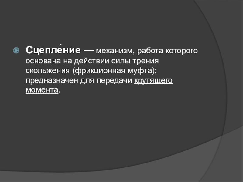 Слайд 3Сцепле́ние — механизм, работа которого основана на действии силы трения скольжения (фрикционная муфта);