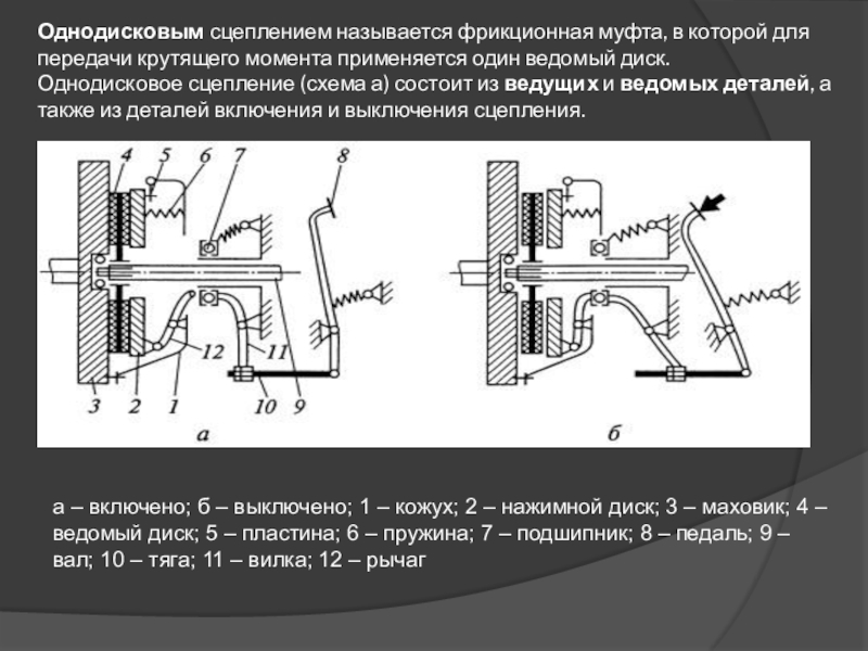 Однодисковое сцепление (схема а) состоит из ведущих и ведомых деталей,