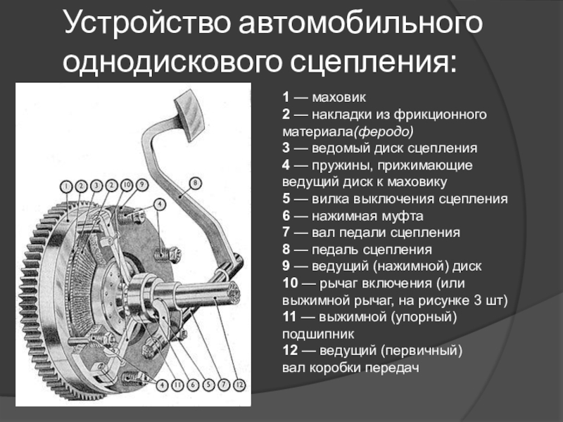 Слайд 6Устройство автомобильного однодискового сцепления: