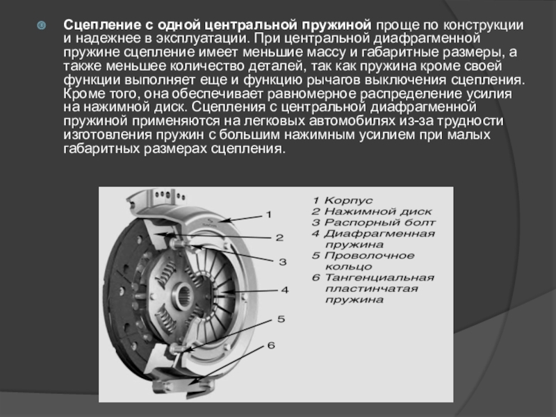 а также меньшее количество деталей, так как пружина кроме своей функции выполняет еще и функцию рычагов выключения сцепления. Кроме того, она обеспечивает равномерное распределение усилия на нажимной диск. Сцепления с центральной диафрагменной пружиной применяются на легковых автомобилях из-за трудности изготовления пружин с большим нажимным усилием при малых габаритных размерах сцепления.