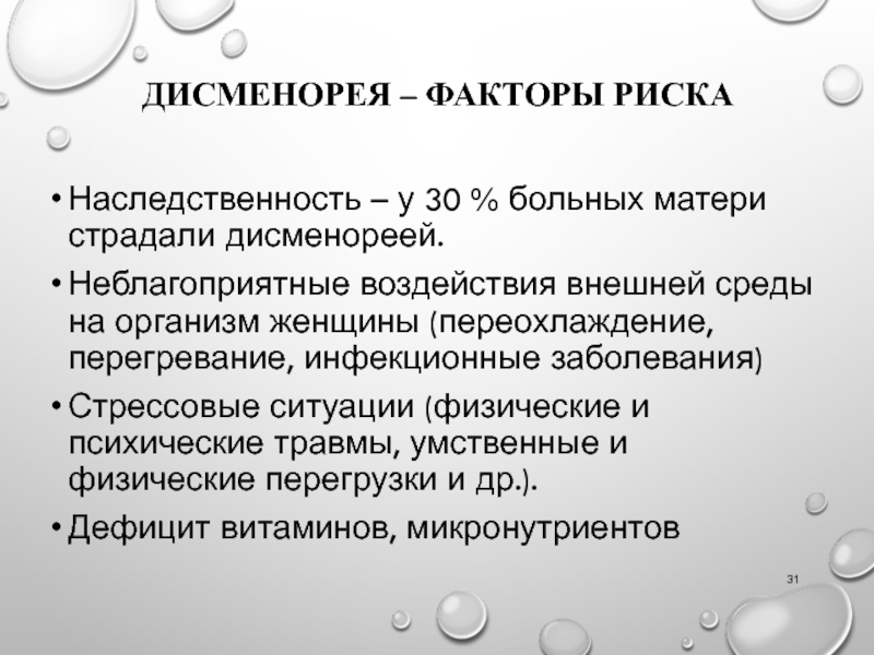 Слайд 31ДИСМЕНОРЕЯ – ФАКТОРЫ РИСКА