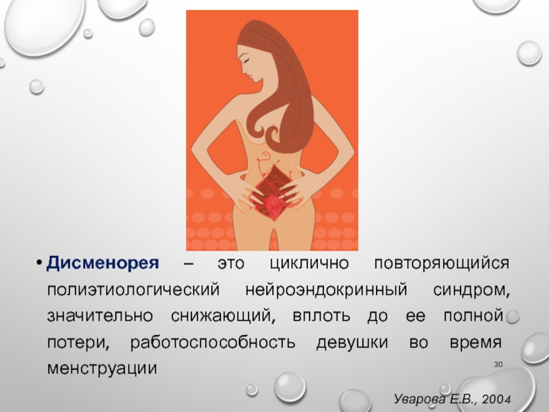Слайд 30Дисменорея – это циклично повторяющийся полиэтиологический нейроэндокринный синдром, значительно снижающий,