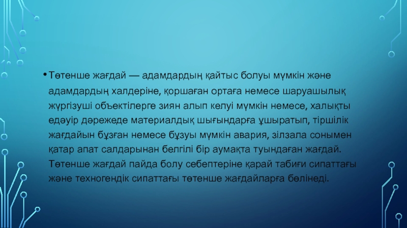 Слайд 5Төтенше жағдай — адамдардың қайтыс болуы мүмкін және адамдардың халдеріне,