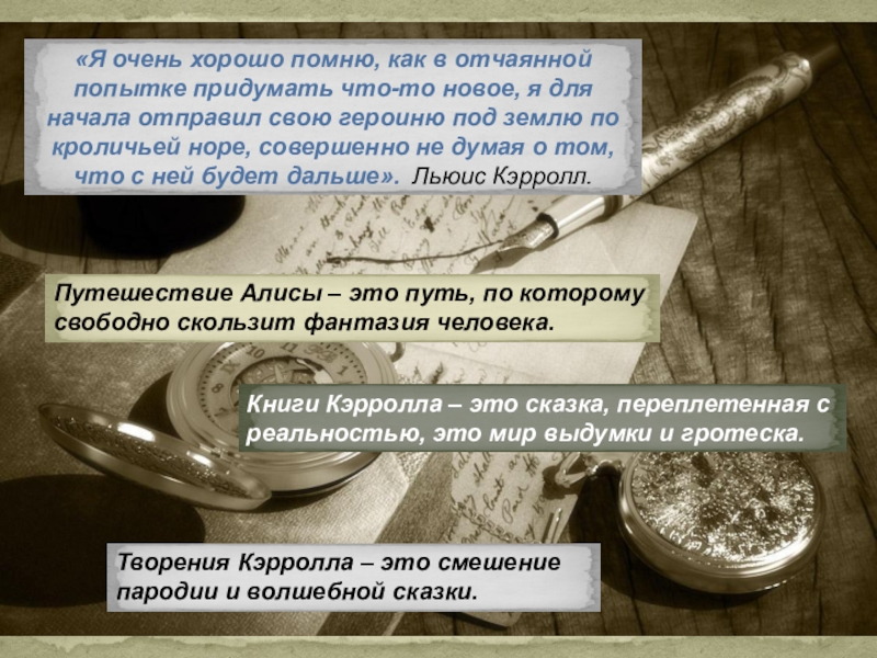 «Я очень хорошо помню, как в отчаянной попытке придумать что-то новое, я для начала отправил свою героиню под землю по кроличьей норе, совершенно не думая о том, что с ней будет дальше». Льюис Кэрролл.