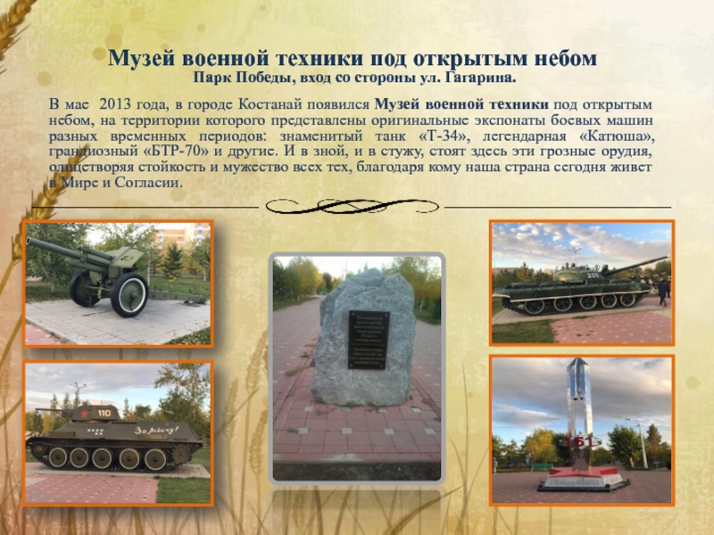 появился Музей военной техники под открытым небом, на территории которого представлены оригинальные экспонаты боевых машин разных временных периодов: знаменитый танк «Т-34», легендарная «Катюша», грандиозный «БТР-70» и другие. И в зной, и в стужу, стоят здесь эти грозные орудия, олицетворяя стойкость и мужество всех тех, благодаря кому наша страна сегодня живет в Мире и Согласии.