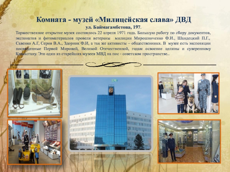 документов, экспонатов и фотоматериалов провели ветераны милиции Мирошниченко Ф.И., Шандецкий П.Г., Савенко А.Г, Серов В.А., Здорник Ф.И, а так же активисты – общественники. В музее есть экспозиции посвященные Первой Мировой, Великой Отечественной, годам освоение целины и суверенному Казахстану. Это один из старейших музеев МВД на пос - советском пространстве..