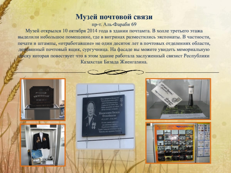 где в витринах разместились экспонаты. В частности, печати и штампы, «отработавшие» не один десяток лет в почтовых отделениях области, деревянный почтовый ящик, сургучница. На фасаде вы можете увидеть мемориальную доску которая повествует что в этом здание работала заслуженный связист Республики Казахстан Бизада Жиенгазина.
