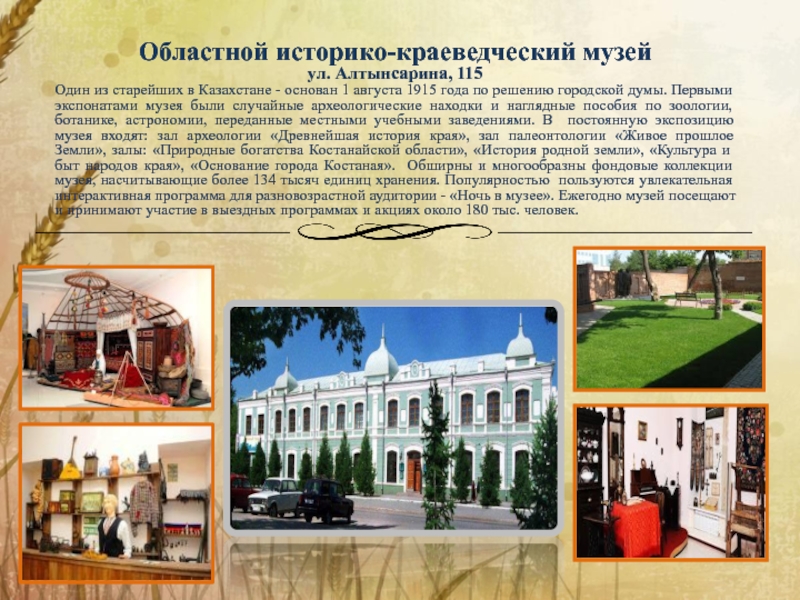 экспонатами музея были случайные археологические находки и наглядные пособия по зоологии, ботанике, астрономии, переданные местными учебными заведениями. В постоянную экспозицию музея входят: зал археологии «Древнейшая история края», зал палеонтологии «Живое прошлое Земли», залы: «Природные богатства Костанайской области», «История родной земли», «Культура и быт народов края», «Основание города Костаная». Обширны и многообразны фондовые коллекции музея, насчитывающие более 134 тысяч единиц хранения. Популярностью пользуются увлекательная интерактивная программа для разновозрастной аудитории - «Ночь в музее». Ежегодно музей посещают и принимают участие в выездных программах и акциях около 180 тыс. человек.