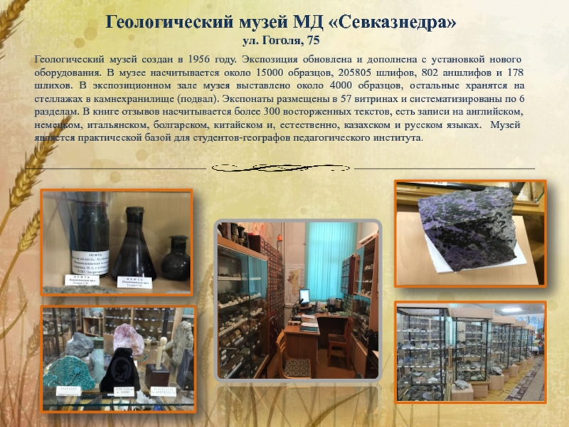 музее насчитывается около 15000 образцов, 205805 шлифов, 802 аншлифов и 178 шлихов. В экспозиционном зале музея выставлено около 4000 образцов, остальные хранятся на стеллажах в камнехранилище (подвал). Экспонаты размещены в 57 витринах и систематизированы по 6 разделам. В книге отзывов насчитывается более 300 восторженных текстов, есть записи на английском, немецком, итальянском, болгарском, китайском и, естественно, казахском и русском языках. Музей является практической базой для студентов-географов педагогического института.