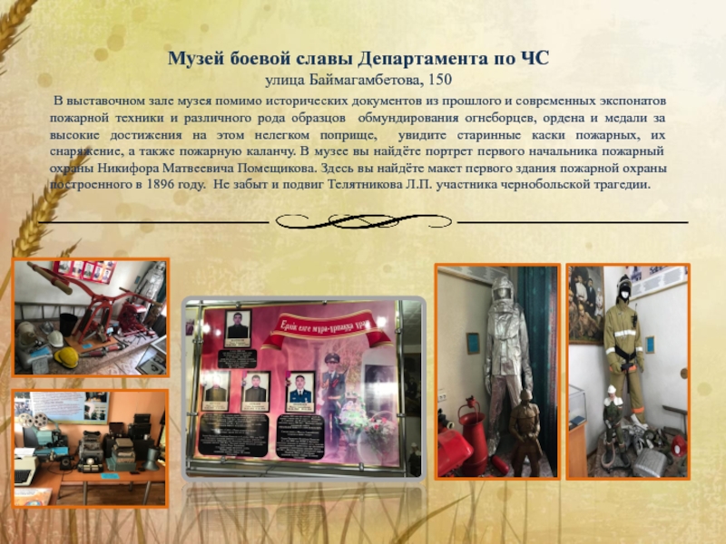 техники и различного рода образцов обмундирования огнеборцев, ордена и медали за высокие достижения на этом нелегком поприще, увидите старинные каски пожарных, их снаряжение, а также пожарную каланчу. В музее вы найдёте портрет первого начальника пожарный охраны Никифора Матвеевича Помещикова. Здесь вы найдёте макет первого здания пожарной охраны построенного в 1896 году. Не забыт и подвиг Телятникова Л.П. участника чернобольской трагедии.