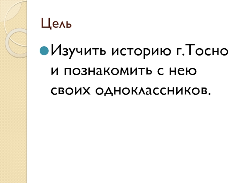 ЦельИзучить историю г.Тосно и познакомить с нею своих одноклассников.