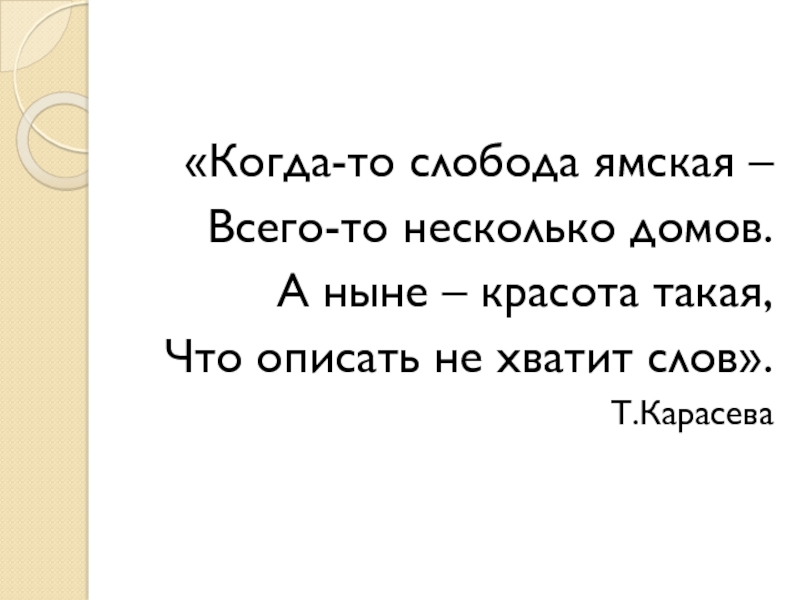 «Когда-то слобода ямская – Всего-то несколько домов.А ныне – красота такая, Что описать не хватит слов».Т.Карасева
