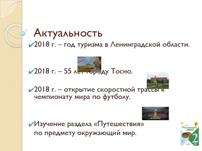 Актуальность2018 г. – год туризма в Ленинградской области. 2018 г. – 55 лет городу Тосно. 2018 г. – открытие скоростной трассы к чемпионату мира по футболу.Изучение раздела «Путешествия» по предмету окружающий