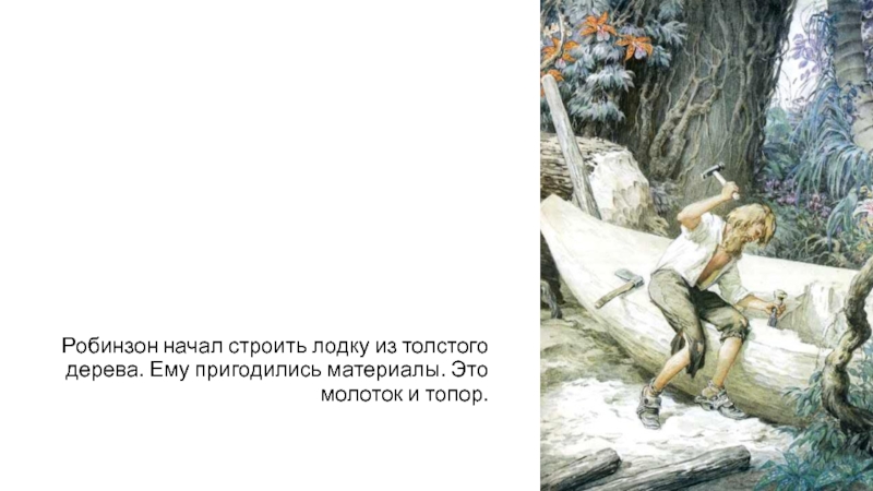 Слайд 10Робинзон начал строить лодку из толстого дерева. Ему пригодились материалы.