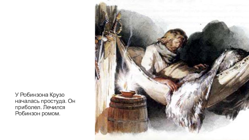 Слайд 7У Робинзона Крузо началась простуда. Он приболел. Лечился Робинзон ромом.