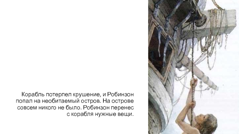 Слайд 4Корабль потерпел крушение, и Робинзон попал на необитаемый остров. На
