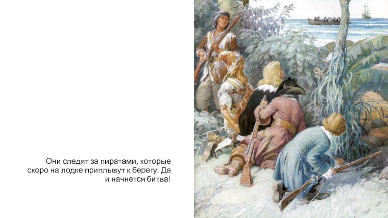 Слайд 18Они следят за пиратами, которые скоро на лодке приплывут к