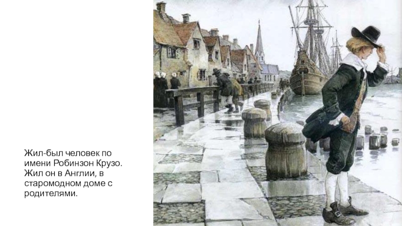 Слайд 2Жил-был человек по имени Робинзон Крузо. Жил он в Англии,
