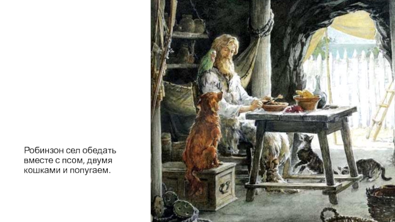 Слайд 12Робинзон сел обедать вместе с псом, двумя кошками и попугаем.