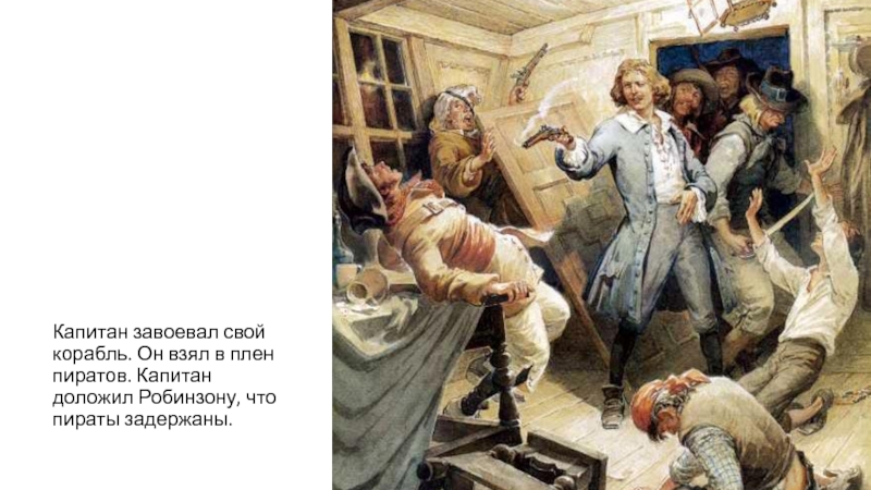 Капитан завоевал свой корабль. Он взял в плен пиратов. Капитан доложил Робинзону, что пираты задержаны.