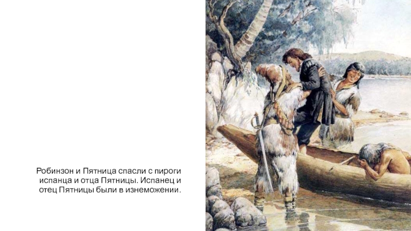 Слайд 16Робинзон и Пятница спасли с пироги испанца и отца Пятницы.