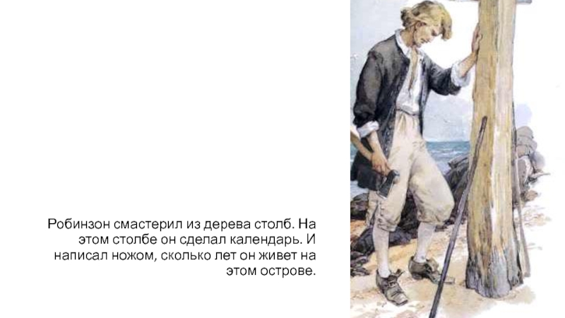 Слайд 5Робинзон смастерил из дерева столб. На этом столбе он сделал