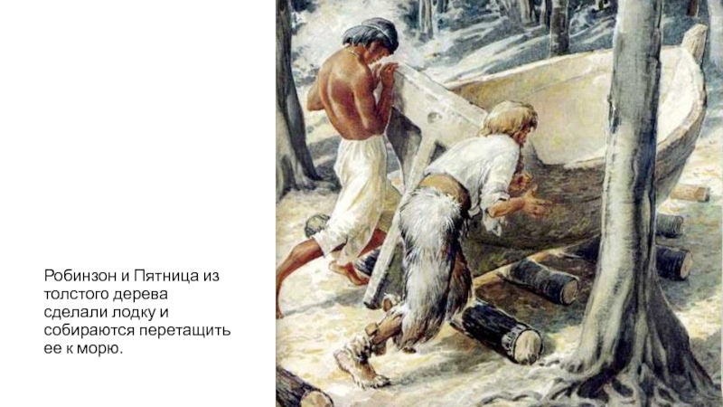 Слайд 15Робинзон и Пятница из толстого дерева сделали лодку и собираются