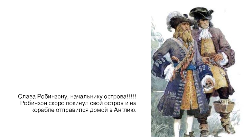 Слайд 20Слава Робинзону, начальнику острова!!!!! Робинзон скоро покинул свой остров и