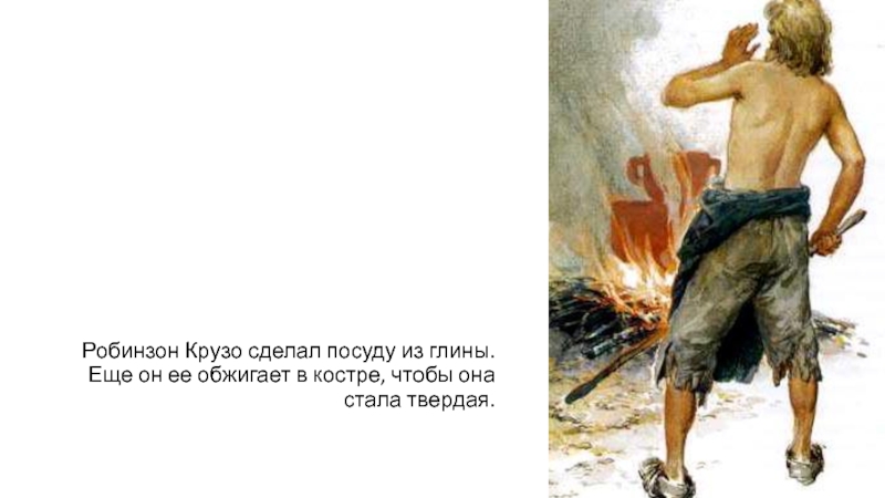 Слайд 9Робинзон Крузо сделал посуду из глины. Еще он ее обжигает