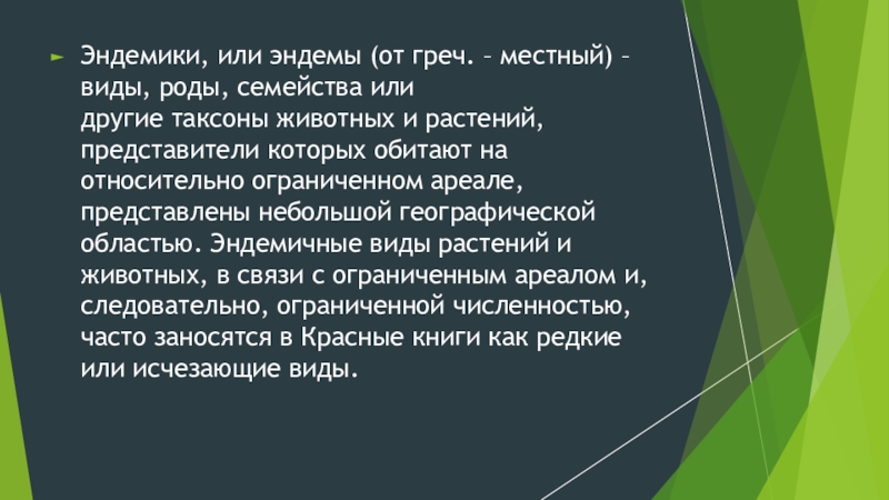Слайд 5Эндемики, или эндемы (от греч. – местный) – виды, роды, семейства или другие таксоны животных и растений, представители которых