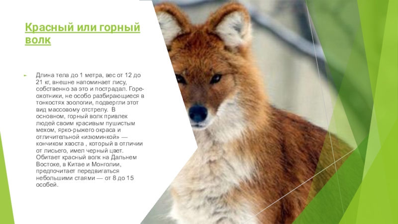 и пострадал. Горе-охотники, не особо разбирающиеся в тонкостях зоологии, подвергли этот вид массовому отстрелу. В основном, горный волк привлек людей своим красивым пушистым мехом, ярко-рыжего окраса и отличительной «изюминкой» — кончиком хвоста , который в отличии от лисьего, имел черный цвет. Обитает красный волк на Дальнем Востоке, в Китае и Монголии, предпочитает передвигаться небольшими стаями — от 8 до 15 особей.