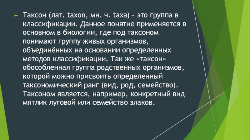 понимают группу живых организмов, объединённых на основании определенных методов классификации. Так же «таксон» обособленная группа родственных организмов, которой можно присвоить определенный таксономический ранг (вид, род, семейство). Таксоном является, например, конкретный вид мятлик луговой или семейство злаков.