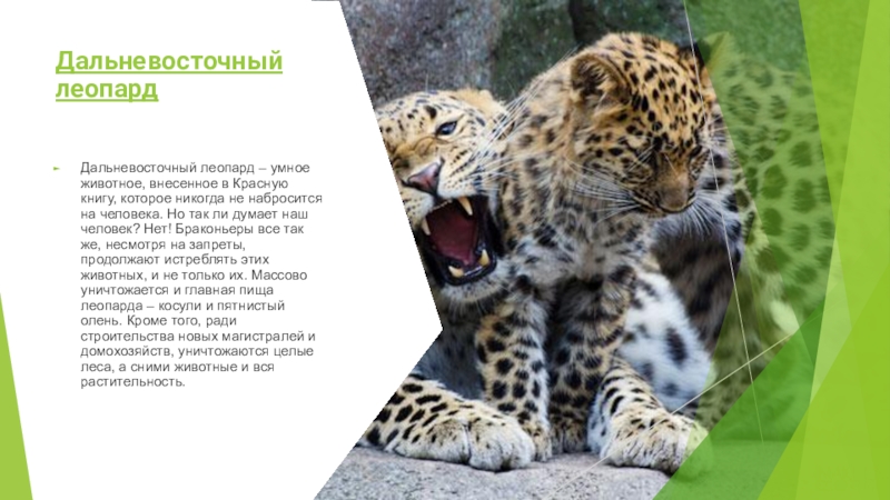 наш человек? Нет! Браконьеры все так же, несмотря на запреты, продолжают истреблять этих животных, и не только их. Массово уничтожается и главная пища леопарда – косули и пятнистый олень. Кроме того, ради строительства новых магистралей и домохозяйств, уничтожаются целые леса, а сними животные и вся растительность.