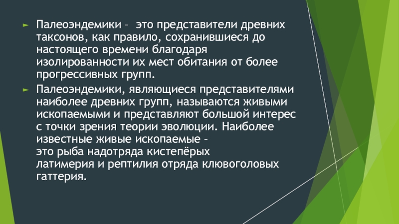 Слайд 6Палеоэндемики – это представители древних таксонов, как правило, сохранившиеся до настоящего