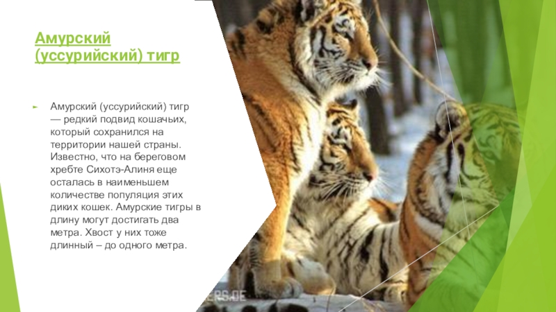 Сихотэ-Алиня еще осталась в наименьшем количестве популяция этих диких кошек. Амурские тигры в длину могут достигать два метра. Хвост у них тоже длинный – до одного метра.