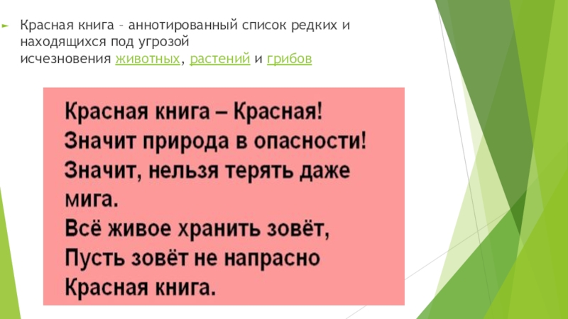 Слайд 2Красная книга – аннотированный список редких и находящихся под угрозой исчезновения животных, растений и грибов