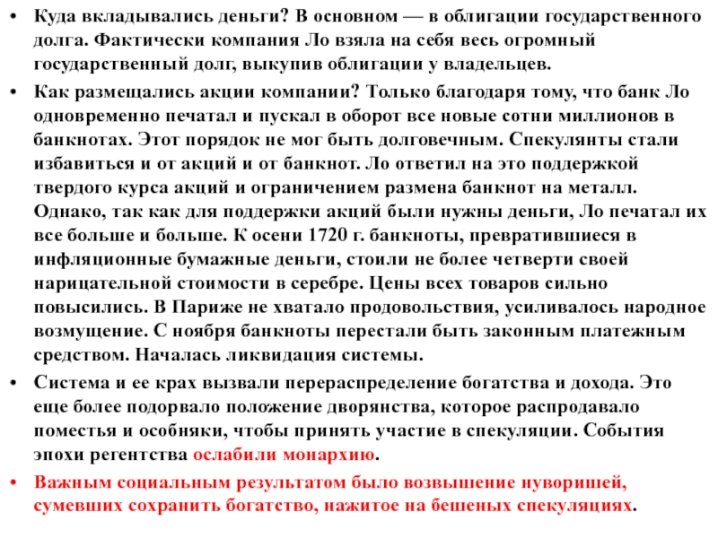 Как размещались акции компании? Только благодаря тому, что банк Ло одновременно печатал и пускал в оборот все новые сотни миллионов в банкнотах. Этот порядок не мог быть долговечным. Спекулянты стали избавиться и от акций и от банкнот. Ло ответил на это поддержкой твердого курса акций и ограничением размена банкнот на металл. Однако, так как для поддержки акций были нужны деньги, Ло печатал их все больше и больше. К осени 1720 г. банкноты, превратившиеся в инфляционные бумажные деньги, стоили не более четверти своей нарицательной стоимости в серебре. Цены всех товаров сильно повысились. В Париже не хватало продовольствия, усиливалось народное возмущение. С ноября банкноты перестали быть законным платежным средством. Началась ликвидация системы.