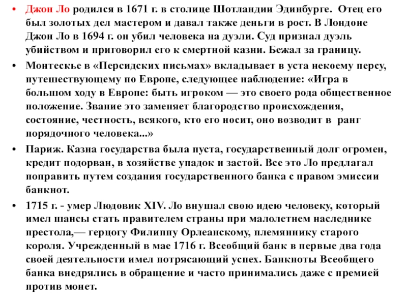 в рост. В Лондоне Джон Ло в 1694 г. он убил человека на дуэли. Суд признал дуэль убийством и приговорил его к смертной казни. Бежал за границу.