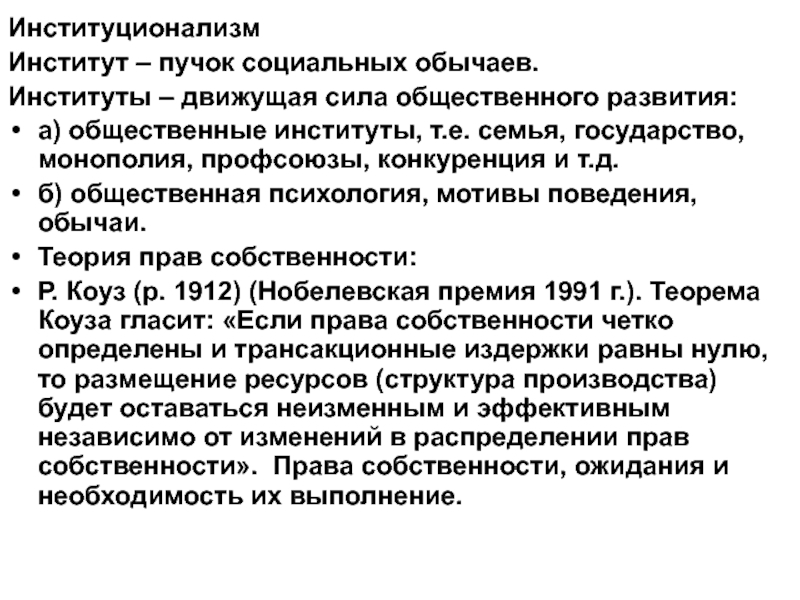 Р. Коуз (р. 1912) (Нобелевская премия 1991 г.). Теорема Коуза гласит: «Если права собственности четко определены и трансакционные издержки равны нулю, то размещение ресурсов (структура производства) будет оставаться неизменным и эффективным независимо от изменений в распределении прав собственности». Права собственности, ожидания и необходимость их выполнение.