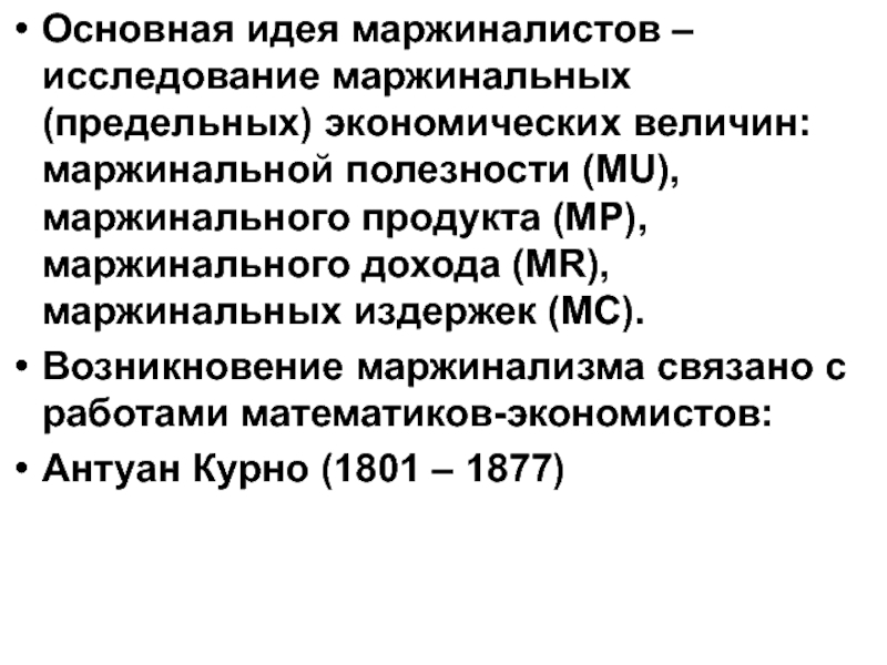 Слайд 13Основная идея маржиналистов – исследование маржинальных (предельных) экономических величин: маржинальной