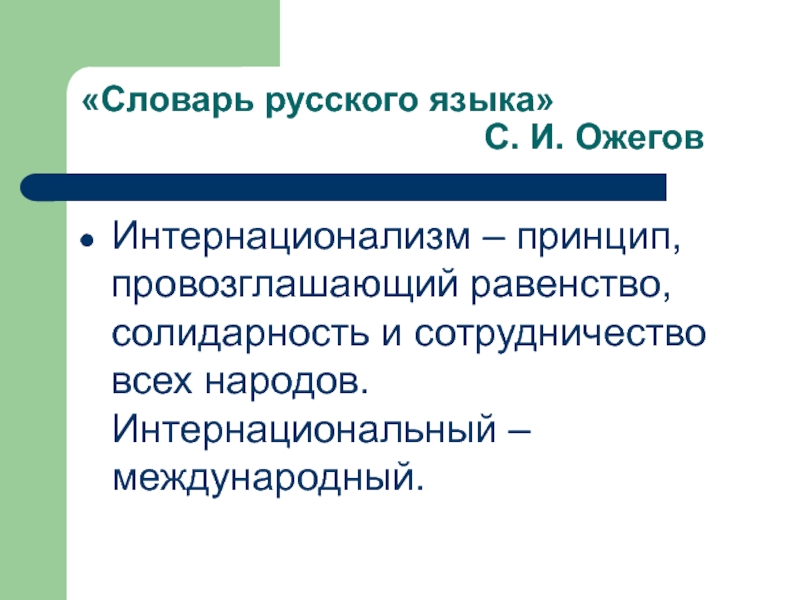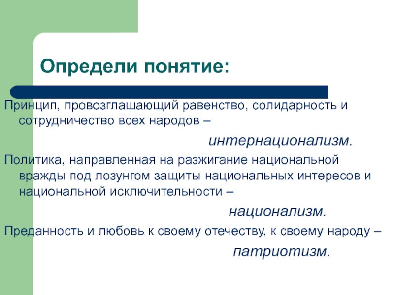 Интернационализм – принцип, провозглашающий равенство, солидарность и сотрудничество всех народов. Интернациональный – международный.