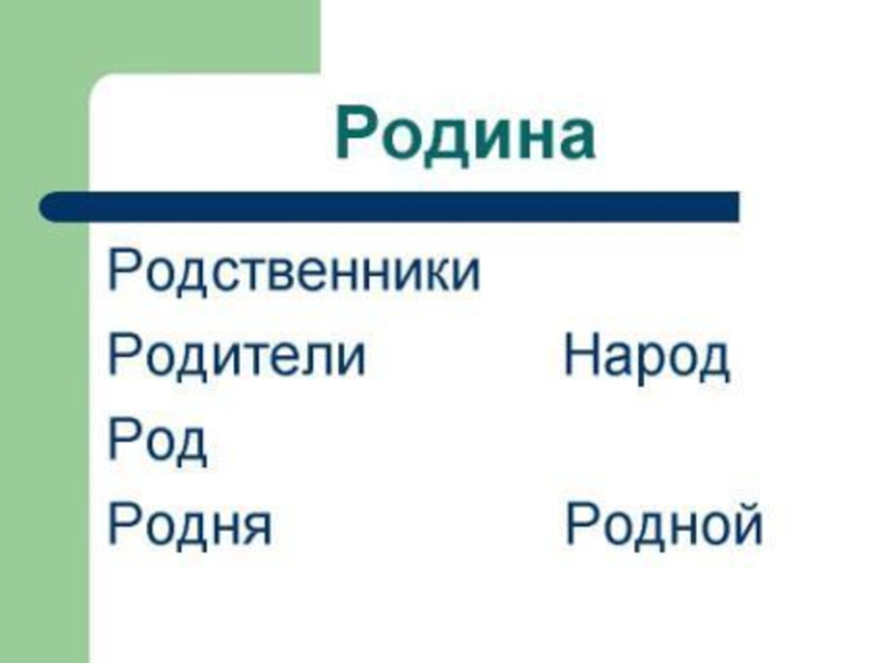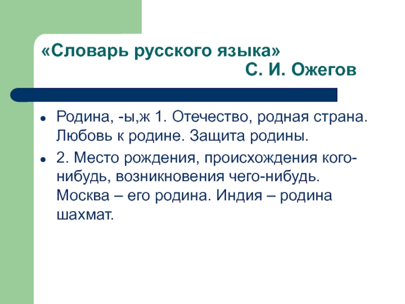 Родина, -ы,ж 1. Отечество, родная страна. Любовь к родине. Защита родины.