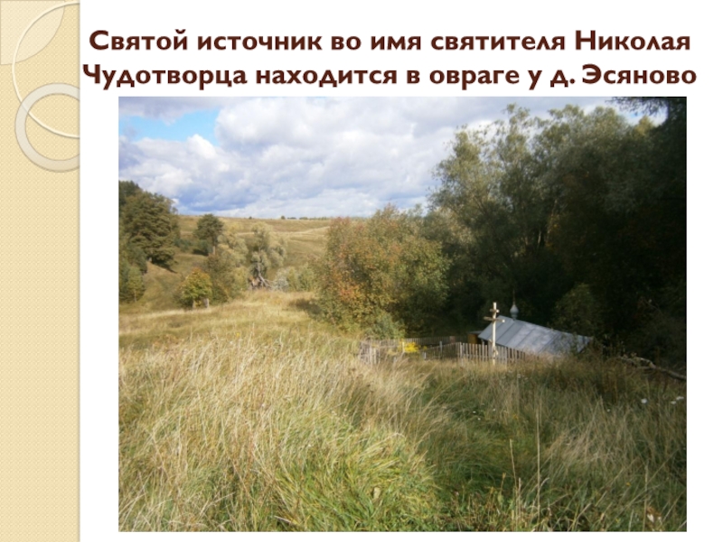 Святой источник во имя святителя Николая Чудотворца находится в овраге у д. Эсяново