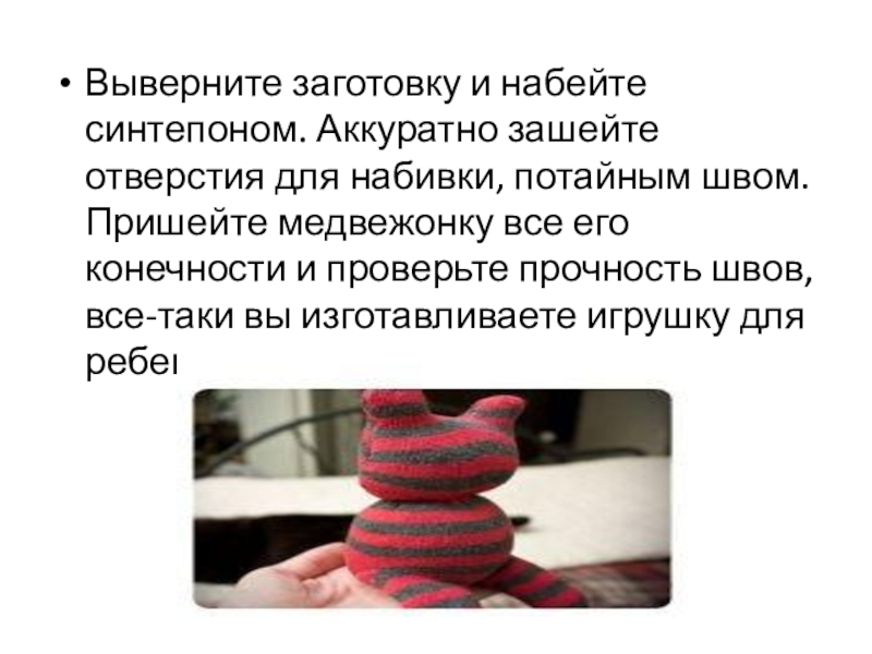 Слайд 7Выверните заготовку и набейте синтепоном. Аккуратно зашейте отверстия для набивки,