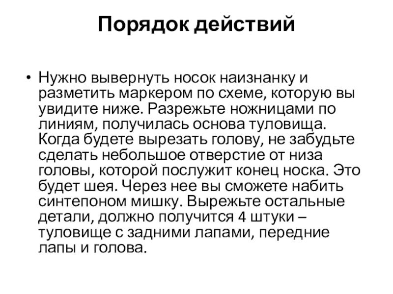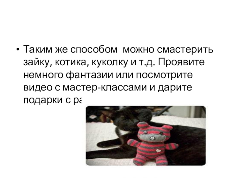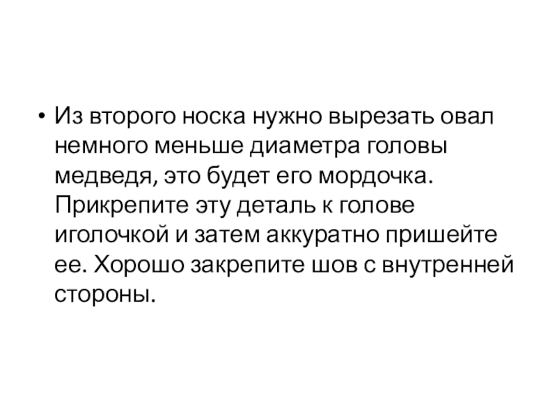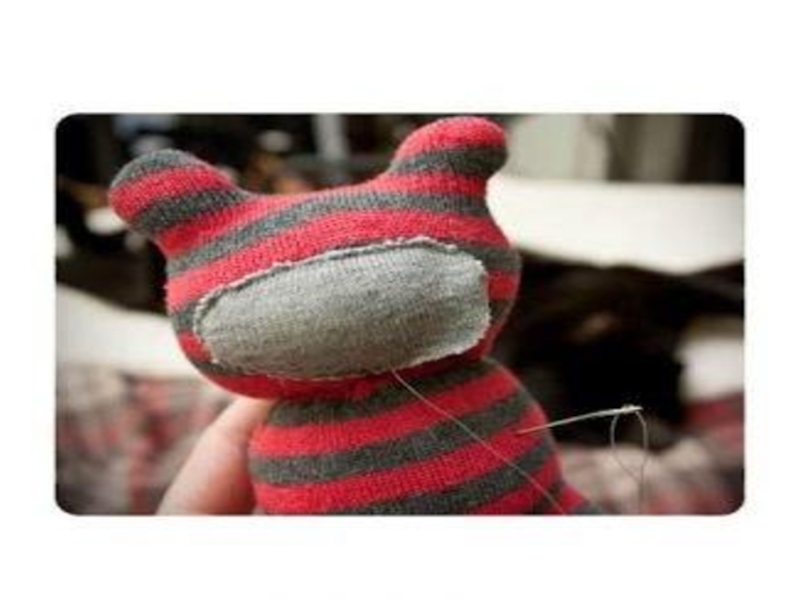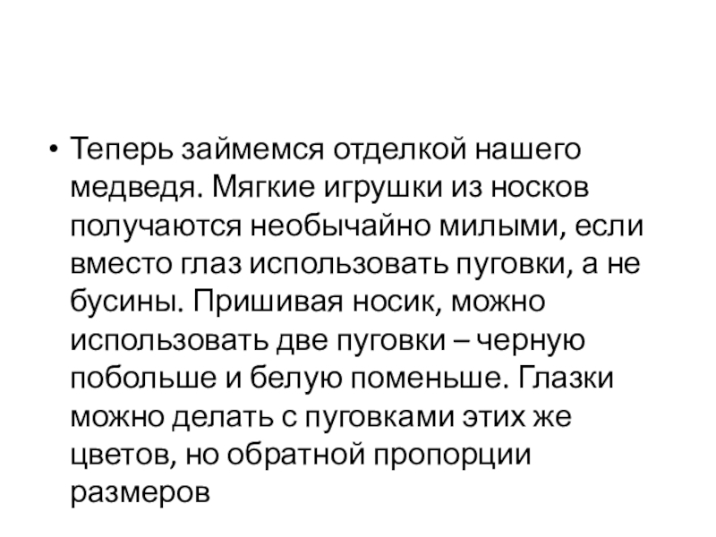 Слайд 10Теперь займемся отделкой нашего медведя. Мягкие игрушки из носков получаются