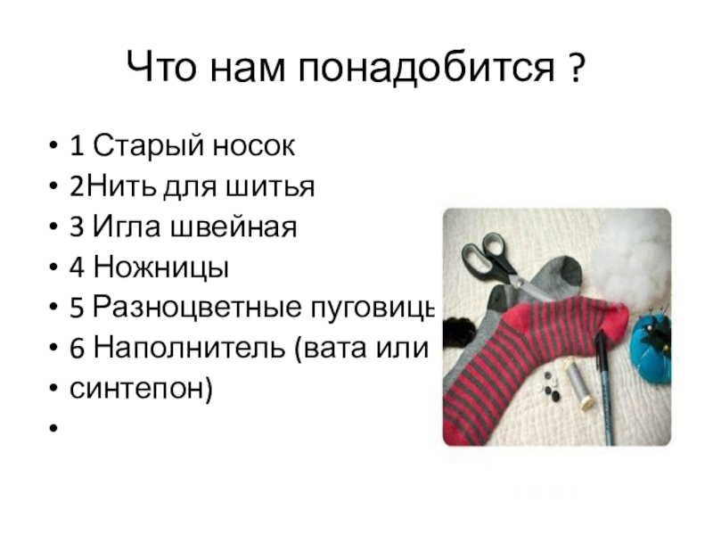 Что нам понадобится ?1 Старый носок2Нить для шитья 3 Игла швейная4 Ножницы5 Разноцветные пуговицы6 Наполнитель (вата или синтепон)