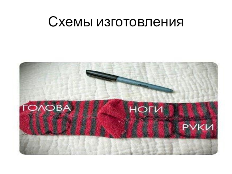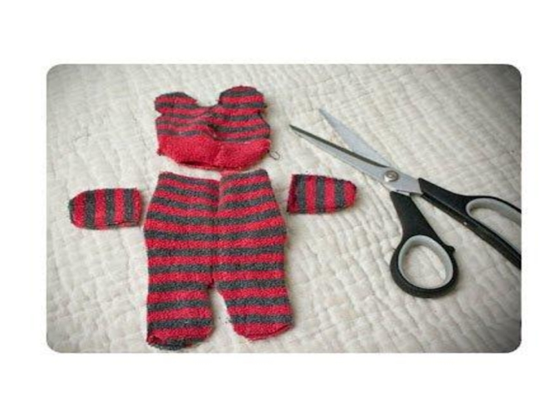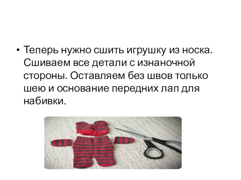Слайд 6Теперь нужно сшить игрушку из носка. Сшиваем все детали с