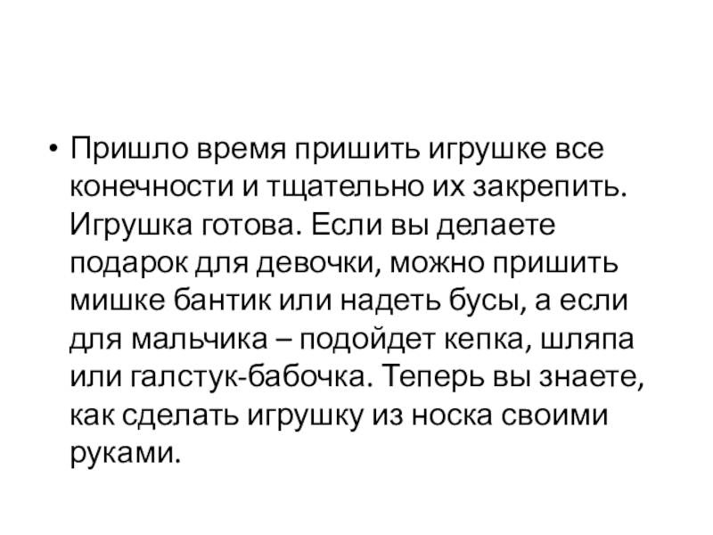 Слайд 12Пришло время пришить игрушке все конечности и тщательно их закрепить.