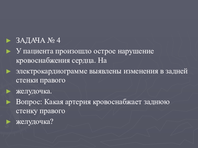 ЗАДАЧА № 4У пациента произошло острое нарушение кровоснабжения сердца. Наэлектрокардиограмме выявлены изменения в задней стенки правогожелудочка.Вопрос: Какая